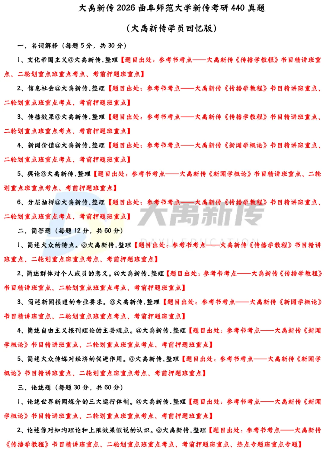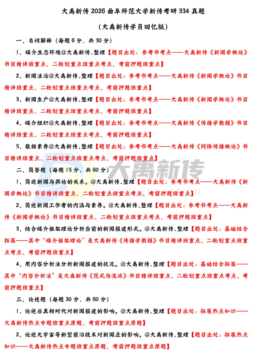 刚刚过去的2026考研初试里,作为系统化开设曲阜师范大学新传考研辅导小班的机构,@大禹新传在 2026 曲阜师范大学新传考研中再创佳绩 ——考试内容100%为课程强调的重点考点,其中直接多次强调的重点原题直接命中分值270分。曲阜师范大学新传考研真题难度偏简单,考察风格以着重考察考生基础知识掌握程度为主,会结合部分拓展内容,整体备考难度不大!且院校最新真题中并未考查新闻史&新闻实务写作,非常适合基础较为薄弱、跨考零基础、复习时间不足、以求稳上岸为目标等等情况的同学,是非常好的上岸选择,大家有意向可以大胆报考!