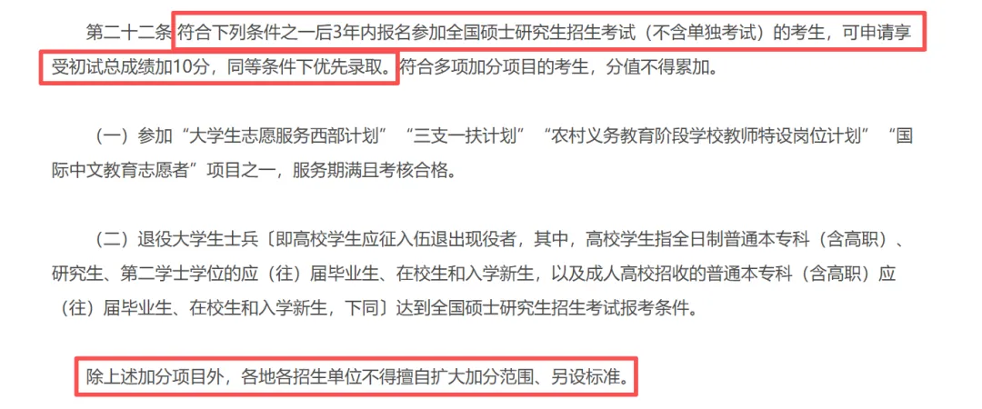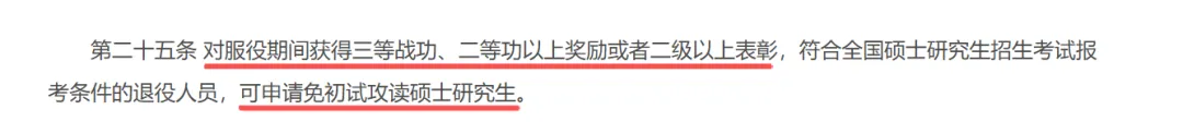 免初试资格范围扩大,服役期间获得三等战功及以上奖励、二级以上表彰的退役人员,可申请免初试攻读硕士研究生(此前仅二等功以上)。
