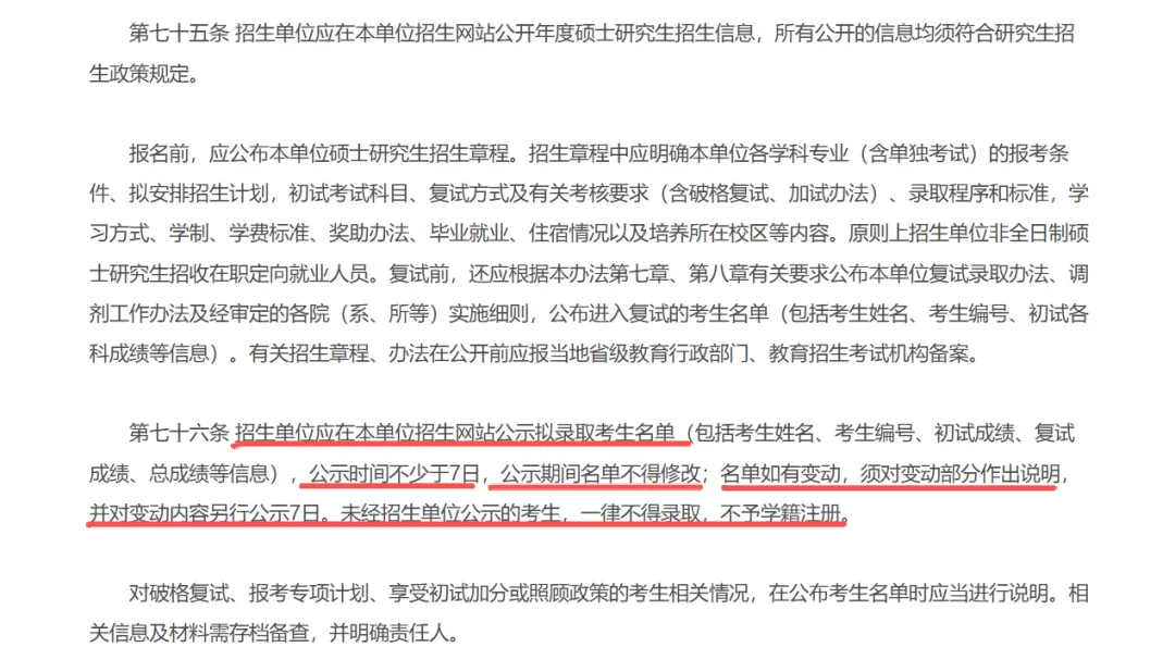 《26年新规》对于复试和录取阶段的信息公开要求更加细致,招生单位要统一公布招生人数、复试考生名单(包括考生姓名、考生编号、初试各科成绩等)等信息;统一公示拟录取考生名单(包括考生姓名、考生编号、初试成绩、复试成绩、总成绩等信息)。公示时间不少于7日,公示期间名单不得修改;名单如有变动,须对变动部分作出说明,并对变动内容另行公示7日。