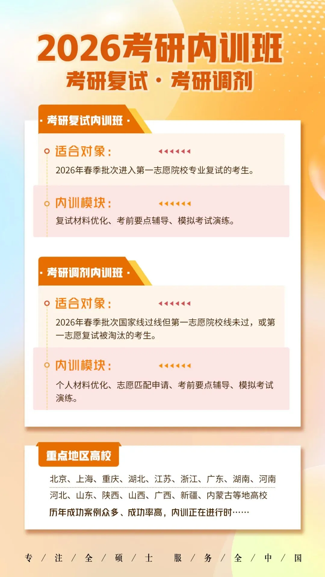 「友情提示」如有必要,考生和家长还可寻求专业机构专业老师的指导和助力,尤其是有资源和懂目标院校专业的复试流程、要点、上岸方法和拥有大量成功案例的专业机构和专业老师。《硕士宝典》专业团队开设有2026考研复试内训班、2026考研调剂内训班,内训班服务费由机构收取并由专业老师提供交付,与所申请高校无关,欢迎咨询报名,预祝华丽上岸!