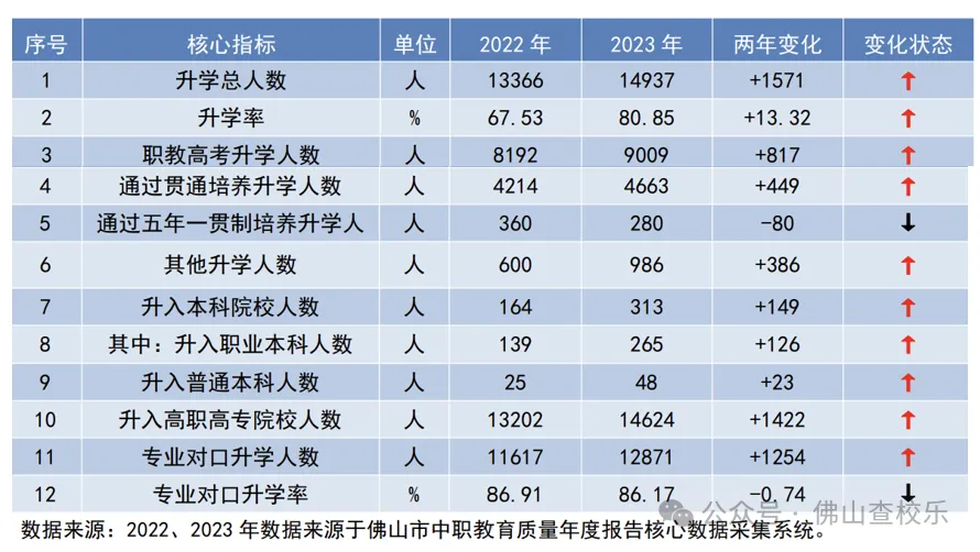 总体来说:2023年,佛山市中职学校的升学率达到了80.85%,相比去年大幅提升,特别是本科升学人数显著增加,体现了中职教育的质量和学生的升学潜力。