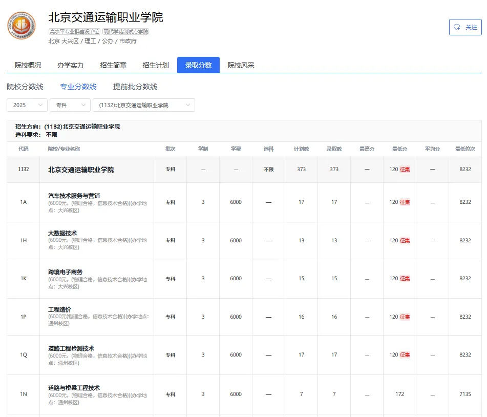 2025年各专业录取分数线/位次: