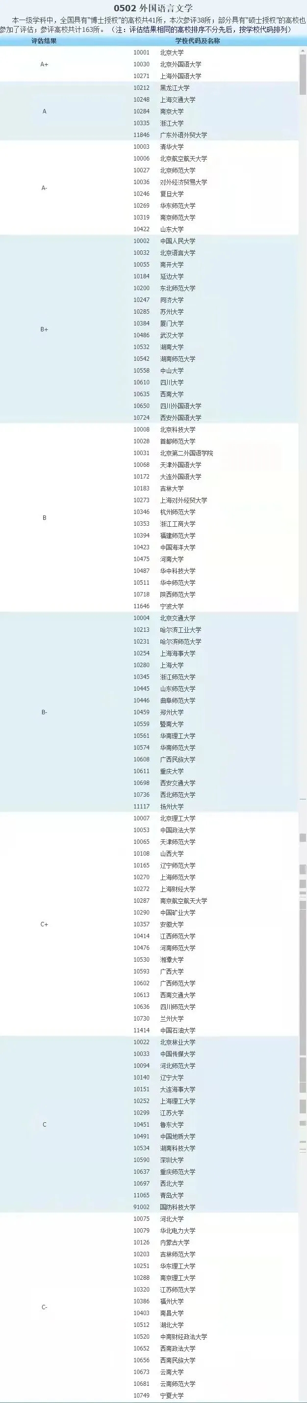 教育部公布的评估是整个外国语言文学类的排名,且得分以等级的形式并列呈现。即,以上排名不仅是英语专业的排名,更是整个学校的外语学科排名。