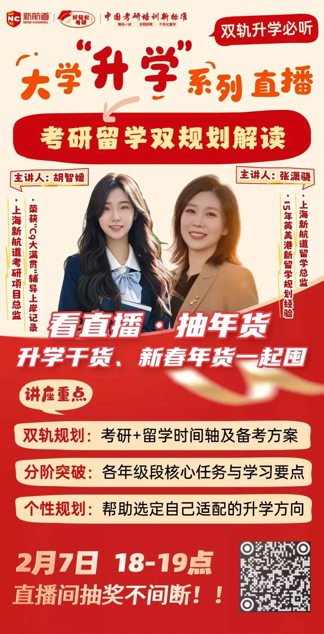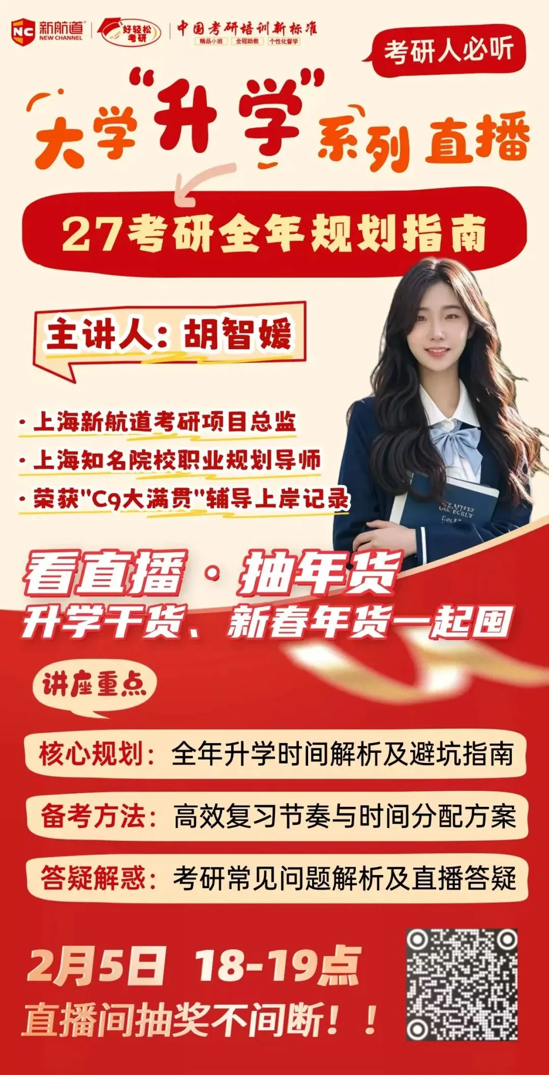 ⏰ 时间:2 月 5 日 18:00-19:00👩🏫 主讲人:胡智媛老师(上海新航道考研项目总监 | 上海知名院校职业规划导师 | 荣获 “C9 大满贯” 辅导上岸记录)