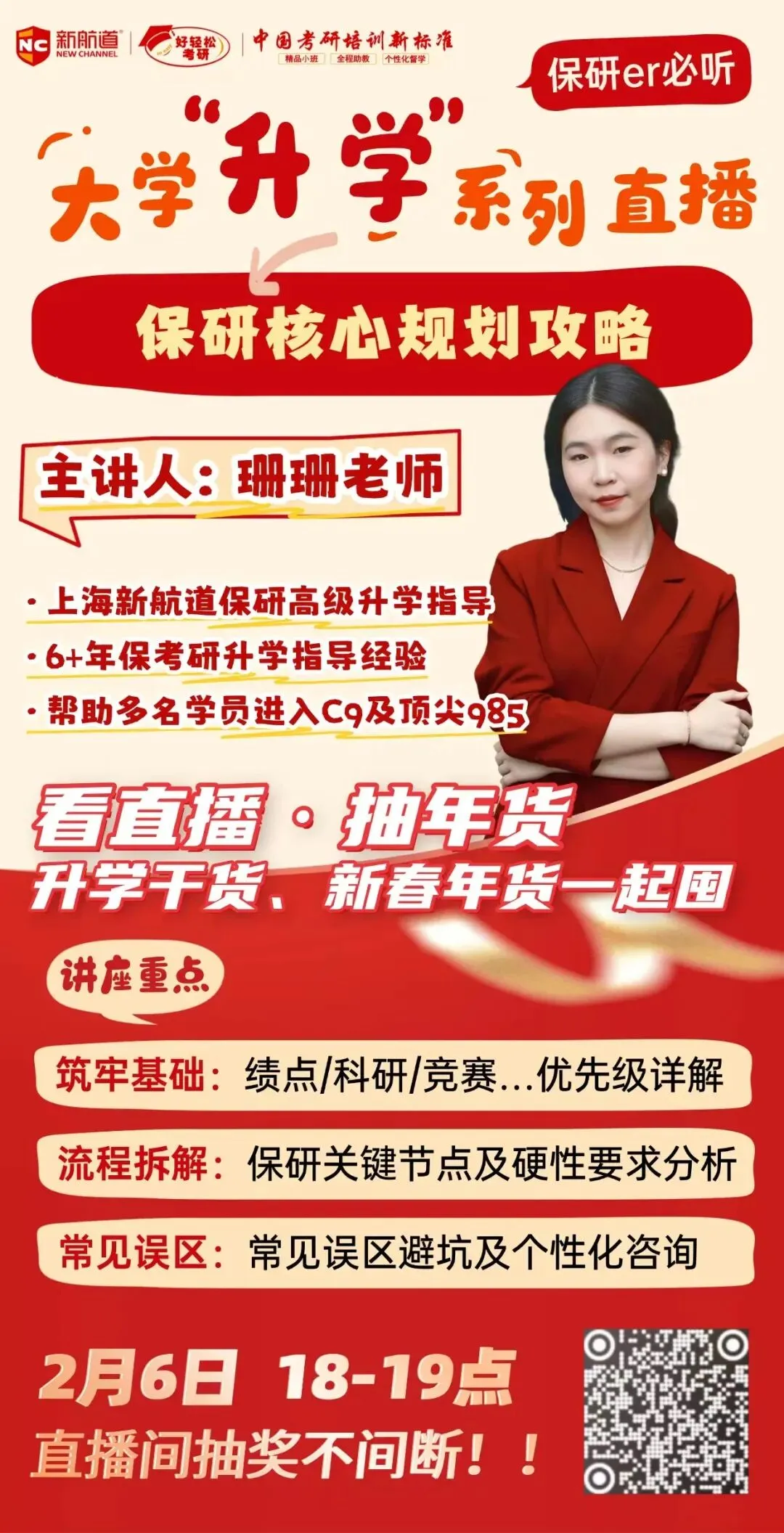 ⏰ 时间:2 月 6 日 18:00-19:00👩🏫 主讲人:珊珊老师(上海新航道保研高级升学指导 | 6 + 年保考研升学指导经验 | 帮助多名学员进入 C9 及顶尖 985)