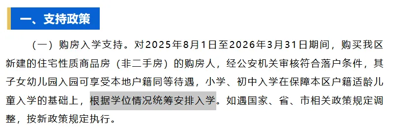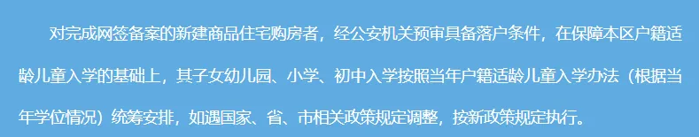 只要满足购房新政的所有条件,小学学位必须保障,初中也是跟户籍生一起参与摇号。