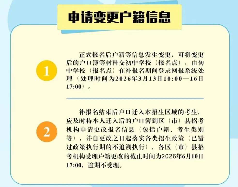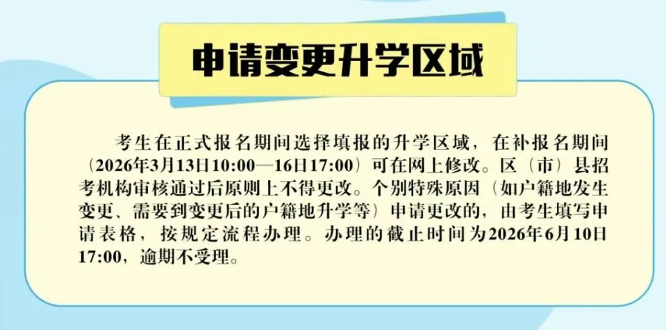 对于因“户籍地发生变更、需要到变更后的户籍地升学”的家庭,若在中考报名结束后,2026年仍按往年惯例,最晚6月10日17:00前提交申请即可。