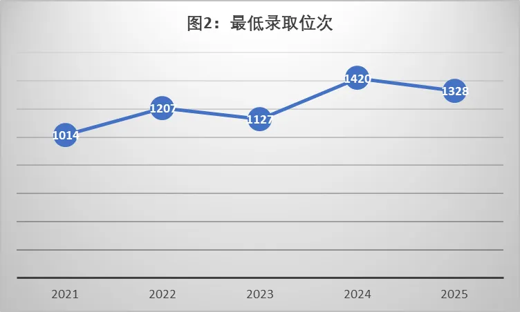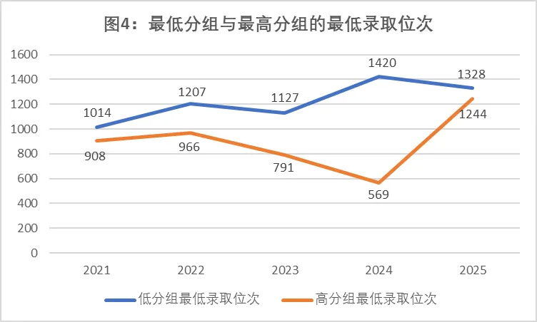图4的最低录取位次呈现出了与最低录取分数相同的趋势。需要注意的是2024年最低分组录取位次与最高分组录取位次差异显著,差了851位。而2025年差了不到100位。所以2024年的异常可能是由于该年是物化绑定高考第一年造成的。