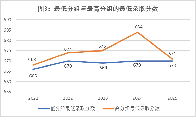 从图3中可看出,中国人民大学最高分组的录取分数线在物化绑定前是逐年升高的,而在物化绑定第一年(2024年),最高分组录取分数提升了9分之多,而在第二年(2025年)又下降了13分之多,也可能是因为物化绑定第一年高考的影响。而最低录取组的分数还比较平稳。