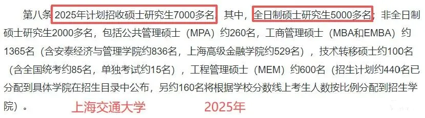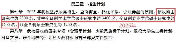 2025年学校计划招生硕士研究生6100人左右,其中全日制硕士研究生5600人左右。可以看到,今年学校总体扩招了100个招生名额,全部分给全日制硕士。