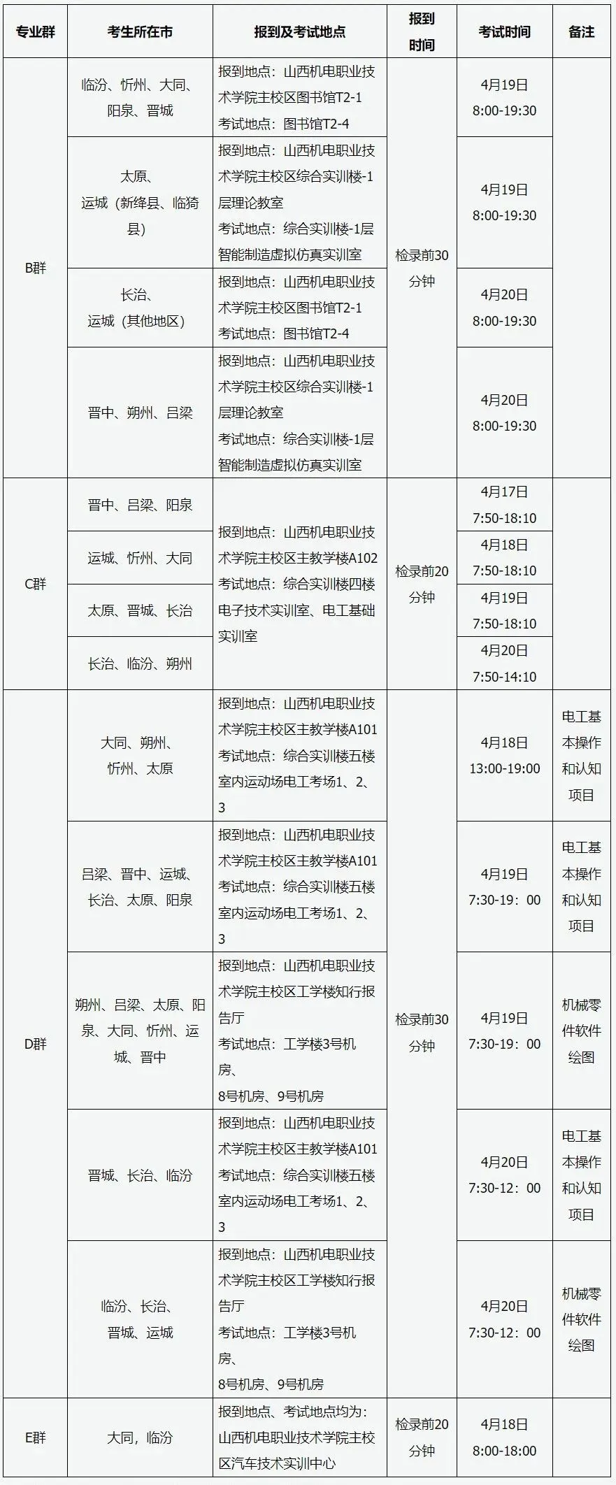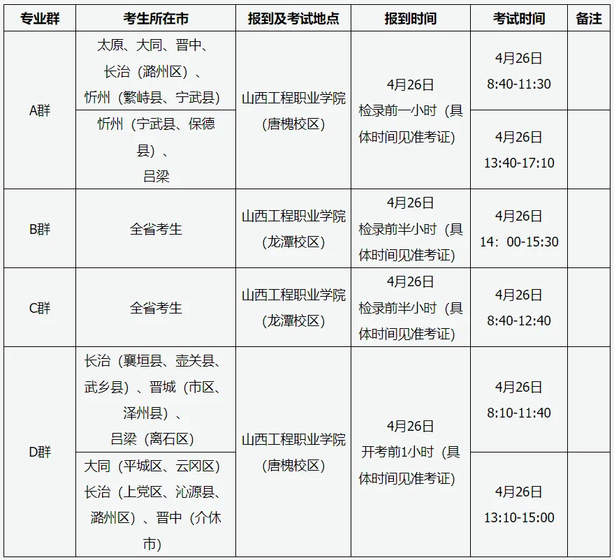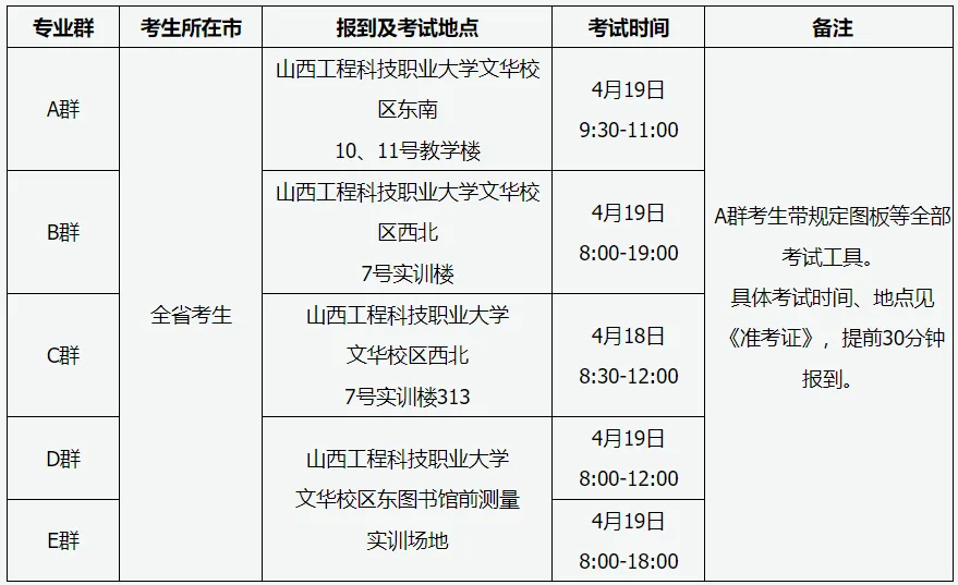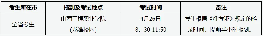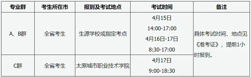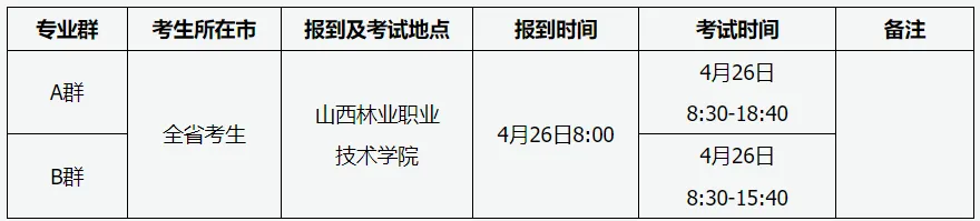 加工制造类、土木水利类、交通运输类、资源环境类、石油化工类、种植园艺类、养殖类、医学相关类、护理类、旅游服务类、文化传媒类、教育类专业基础知识考试采用机试办法,在生源学校或指定考点院校进行。考试时间4月10日-12日,具体考试时间及地点见《专业基础知识考试准考证》,考试期间技术支持电话:0351—5633910,5633912。