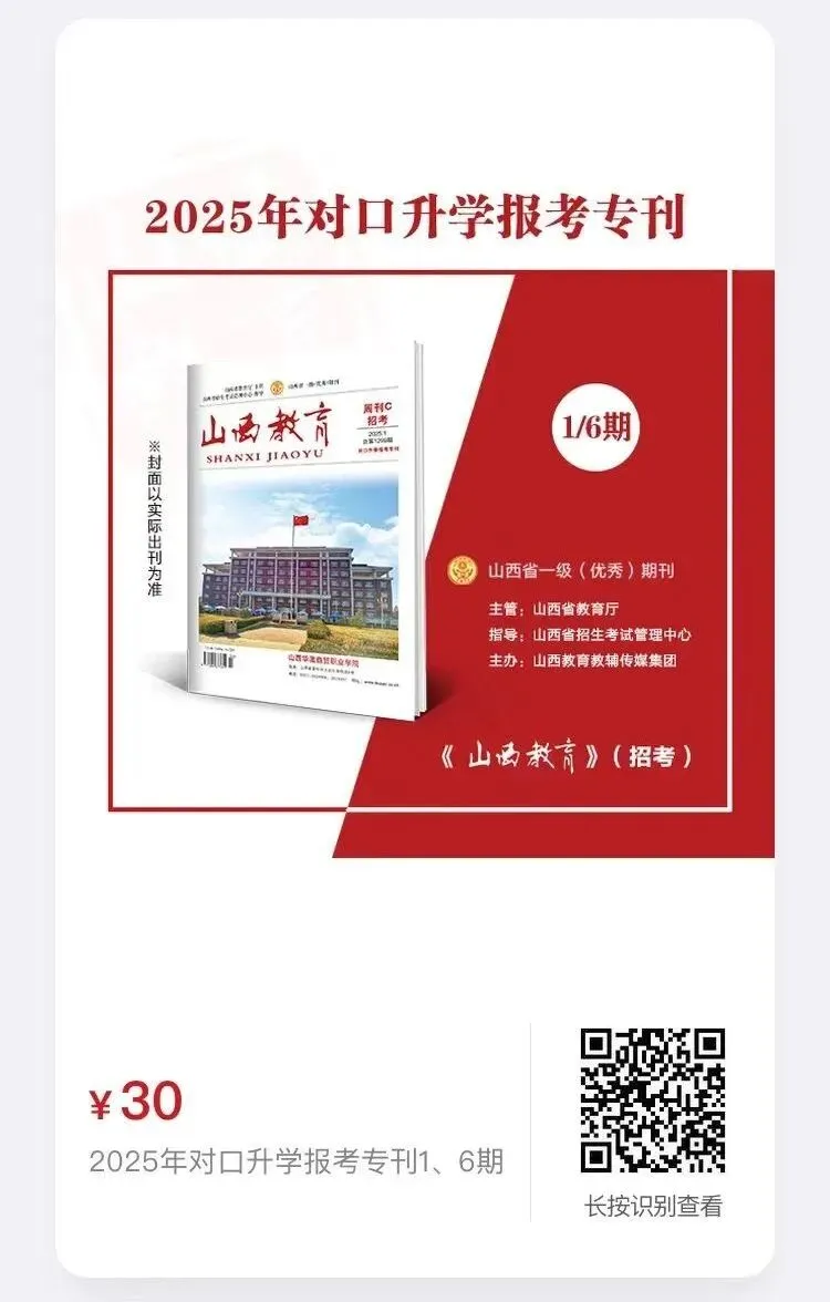 《山西教育》周刊C(招考)杂志是山西省唯一一份面向广大山西考生的招生考试类权威期刊。本刊官方微信公众平台发布高考、成考、自考和对口升学、专升本、研究生考试等各类招考权威信息。