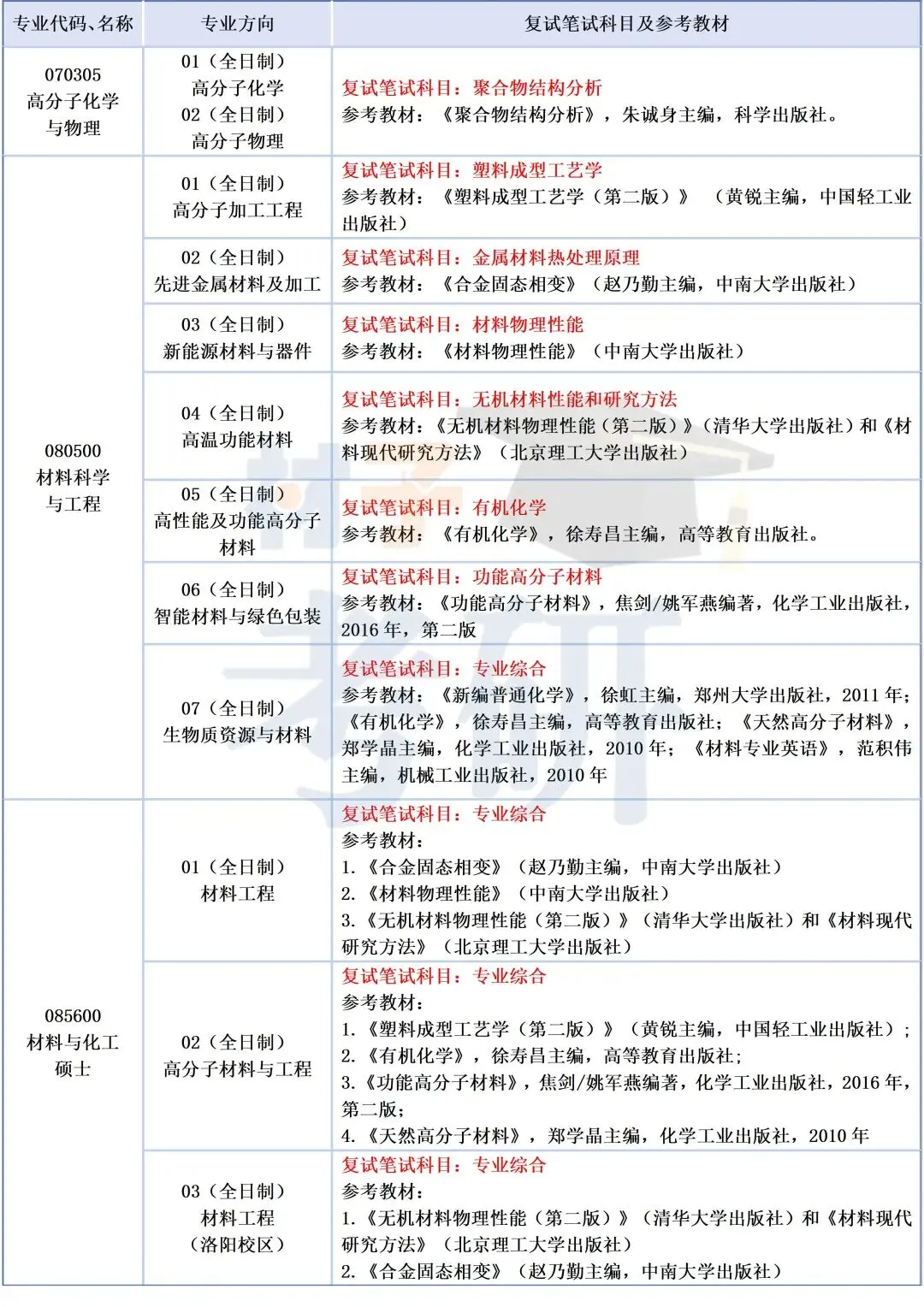 注:本表格给出的是25考研复试的参考书目,26考研的招生目录中未给出参考书目。此外材料与化工复试科目为三选一,并不是三门课都需要考试,大家可以自己选择一个比较擅长的科目进行准备。