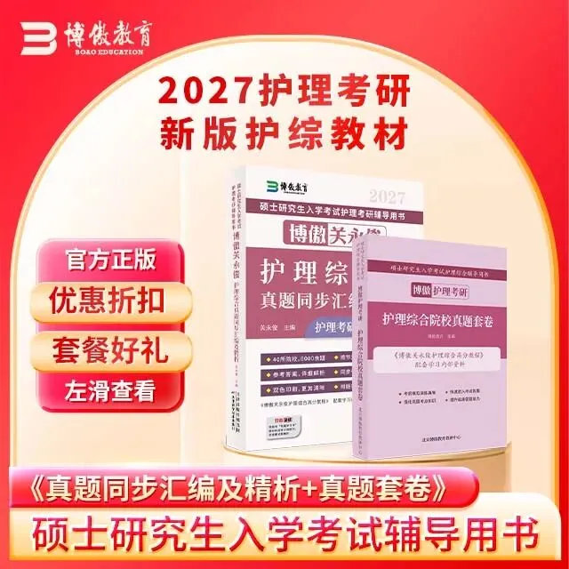 温馨提示:有意报考护士、护师考试或护理考研的朋友,依据自己的复习阶段需求,选择对应图书资料,基础教材+试题强化+试卷模拟+口袋书,自由组合搭配,总有一种方案适合你!