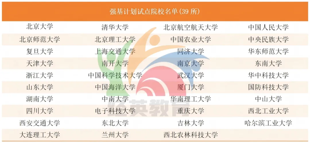 强基计划是教育部 2020 年启动的基础学科招生改革试点,,聚焦国家重大战略领域,选拔培养基础学科拔尖且有志服务国家战略的学生,由 39 所 “双一流” 高校试点,采用 “高考 85%+ 校考 15%” 综合评分录取,实行本 - 硕 - 博衔接培养。