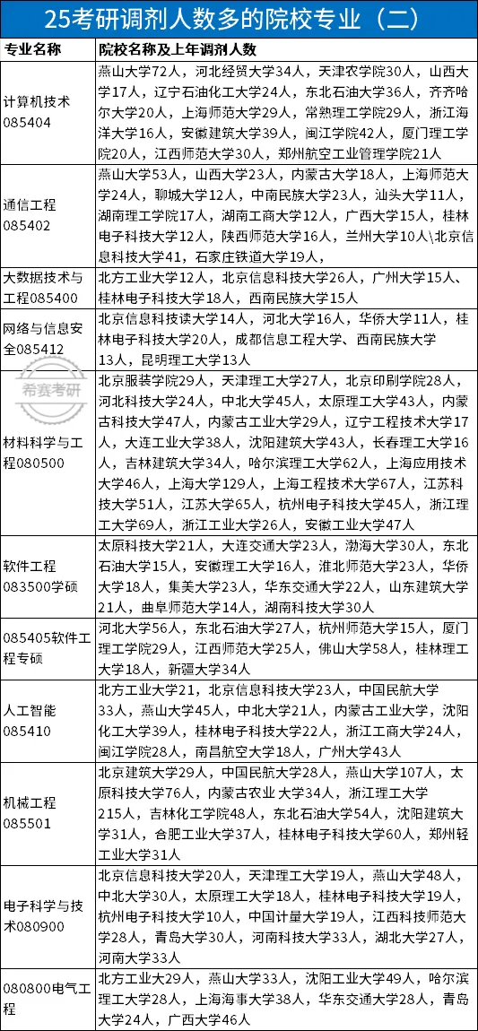 上期各个学科大类都列举一个专业,本期列举的是当下热门工科专业调剂人数多的院校,有计算机技术、通信工程、大数据技术与工程、网络与信息安全、材料科学与工程、软件工程、人工智能、机械工程、电子科学与技术、电气工程,下面这些院校26考研出现调剂的机会很高,具体如下图:
