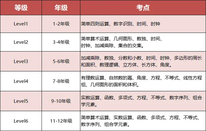 袋鼠竞赛考察的知识点都是比较基础的算术运算,简单几何,四则运算,简单组合等知识点,但是每个年级考察的知识点不同,具体如下: