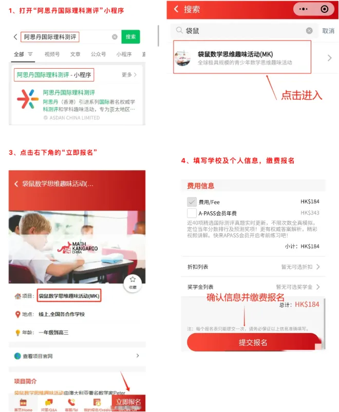 学校是官方合作考点,也可以家长通过微信小程序阿思丹国际理科测评进行报名