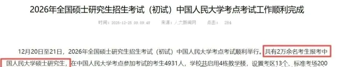 2026年,共有2万余名考生报考中国人民大学硕士研究生,人文社科领域的顶尖实力,让该校在相关专业的竞争中尤为激烈。