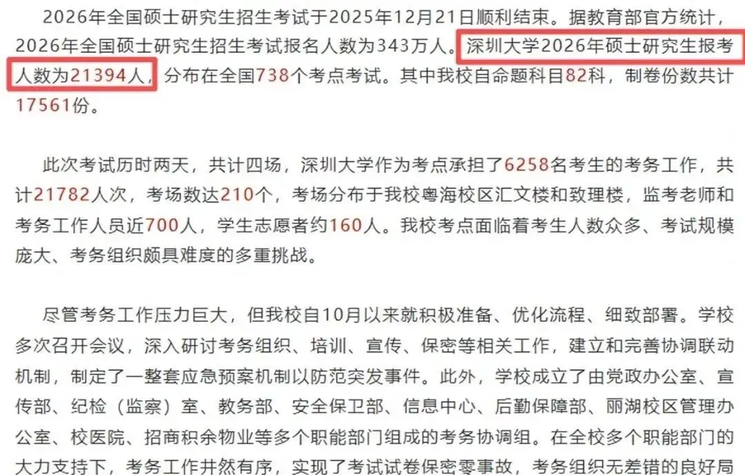 2026年深圳大学硕士研究生报考人数为21394人,依托粤港澳大湾区的区位优势与快速发展的学科建设,成为近年来热度飙升的新兴热门院校。