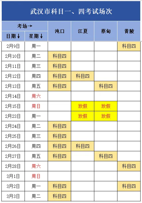 武汉最新科目四考试安排2026年2月9日-3月3日