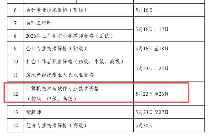 小友们,人力资源社会保障部已公布2026年度专业技术人员职业资格考试的工作计划及相关安排,其中明确了软考的考试时间。具体如下: