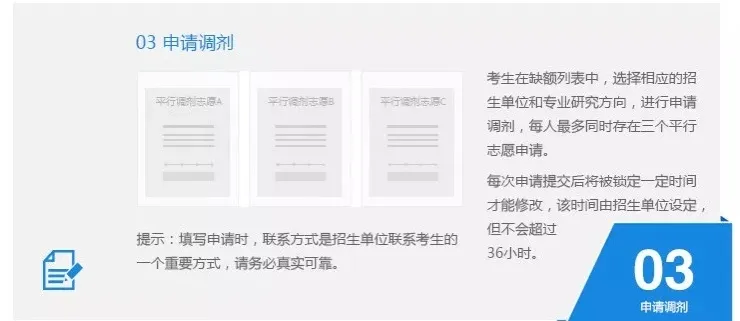 参加调剂的考生,在调剂系统中可一次填报三个平行调剂志愿,每个调剂志愿提交后即由招生单位锁定,锁定时间由各招生单位自主设定,最长不超过36小时。招生单位根据本单位调剂工作情况确定是否接收考生参加复试。如招生单位拒绝考生调剂申请,则调剂志愿同时解锁,考生可继续填报其他志愿。锁定时间结束后,系统自动解锁,考生可继续等待或改报其他志愿。