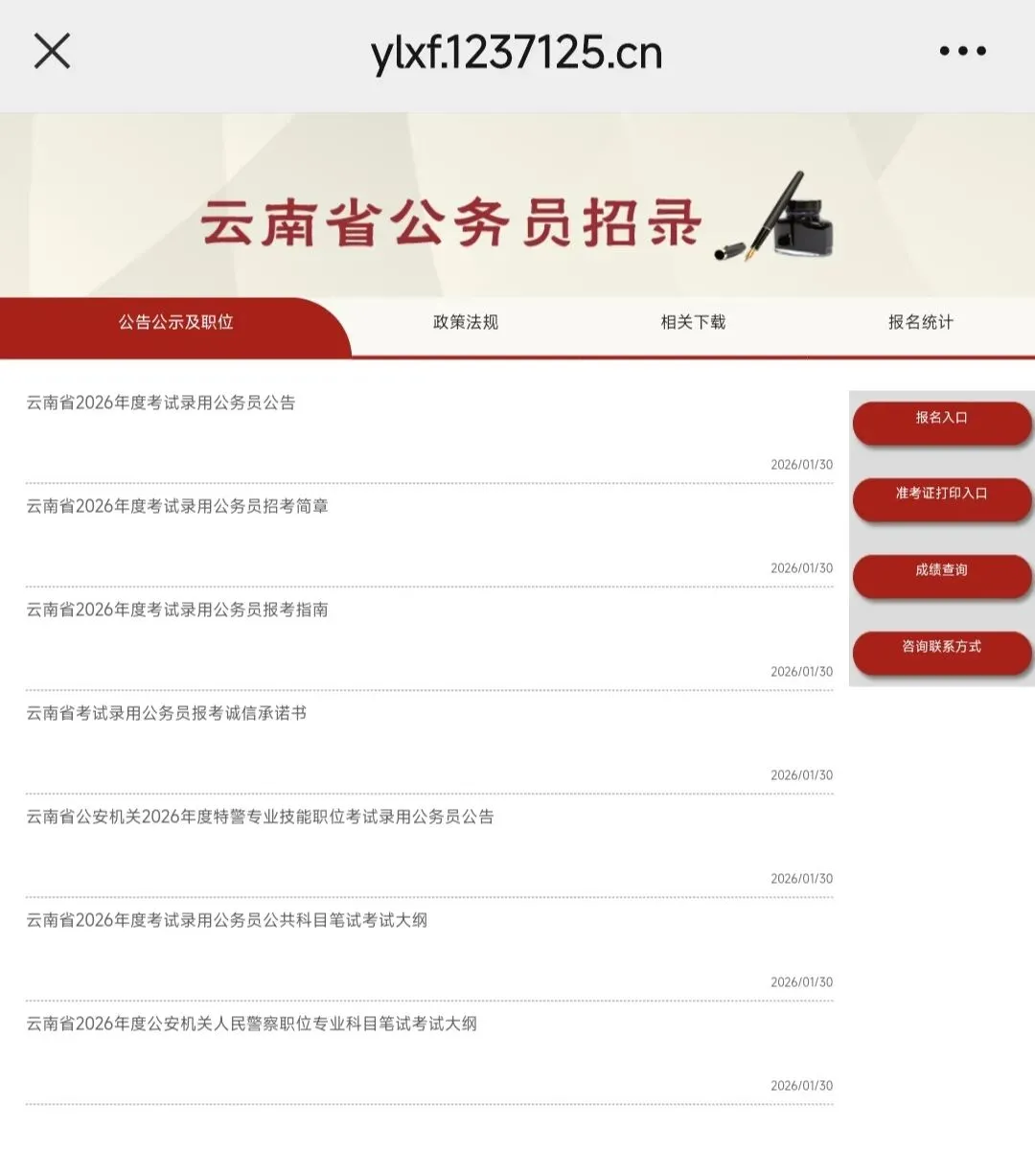 (一)本次招考指定网站为云岭先锋网“云南省公务员招录”专栏(https://ylxf.1237125.cn/TopicWeb/ynskslygwy/index.html)。本次招考不委托任何机构或个人对外发布招考信息,请广大报考者切勿轻信任何冠以“内部消息”“独家渠道”等有关招考信息,避免上当受骗。因查看其他渠道的错误信息影响考试或造成个人信息泄露的,由报考者自行负责。