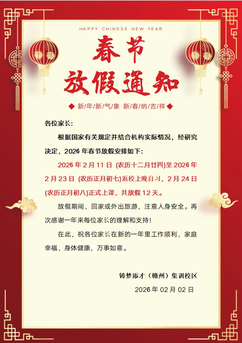 时序更替,岁末将至。在辞旧迎新之际,华铭教育研究院(铸梦添才)全体教师向各位家长和同学致以诚挚的节日问候!为让大家度过一个安全、充实且有意义的假期,现将寒假安排及相关注意事项通知如下: