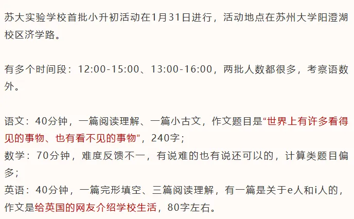 苏大实验2026首批小升初考试