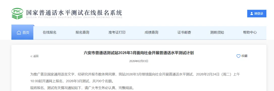 为推广普及国家通用语言文字,经研究并报市教体局同意,我站2026年3月继续面向社会开展普通话水平测试,2026年2月24日(周二)上午10:00起开通网上报名,2026年3月测试,共700个名额。