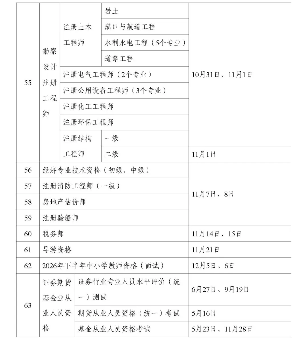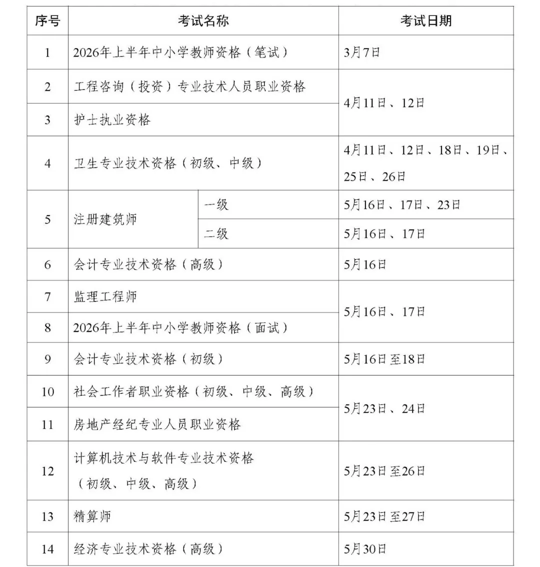 2026年度专业技术人员职业资格考试时间表