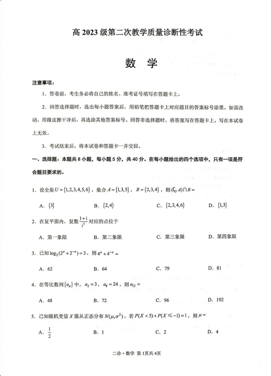 泸州市高2023级第二次教学质量诊断性考试数学试题及详细答案