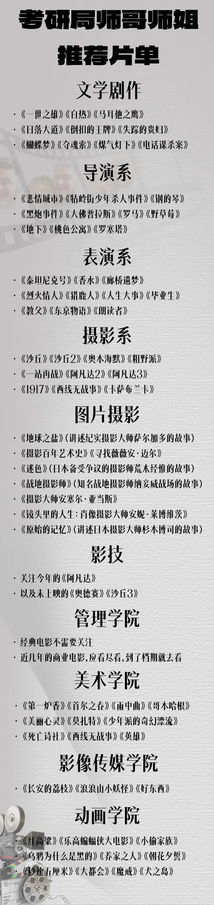 不论是备考导演系摄影系还是表演学院、影像传媒学院,只要你备考的是北京电影学院,阅片一定是必不可少的。阅片也不是漫无目的的盲看,而是系统化、目标化、与理论学习同步的去看。