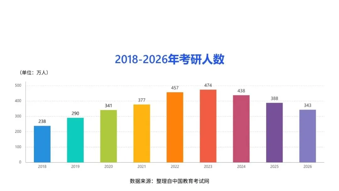 中国教育考试网最新数据显示,2026年全国硕士研究生招生考试报名人数为343万人,较去年的388万人大幅减少,这也是考研报名人数连续下降的第三年。