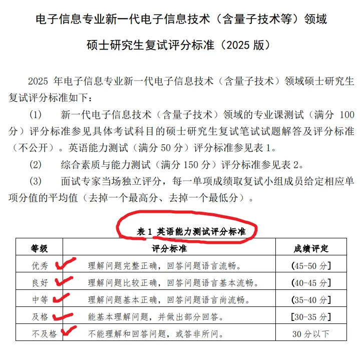 注意,不同学校复试面试评分标准有差别,下面是多所高校的打分表,大家可以综合对比看一看。佛山大学新一代电子信息技术(含量子技术)硕士研究生复试评分标准(2025版)下面这份复试评分标准非常详细,复试总分 = 专业课测试(100分) + 英语能力测试(50分) + 综合素质与能力测试(150分)