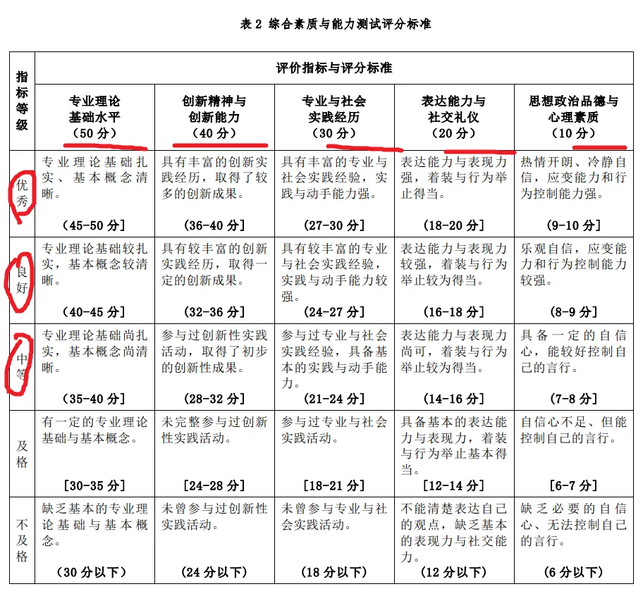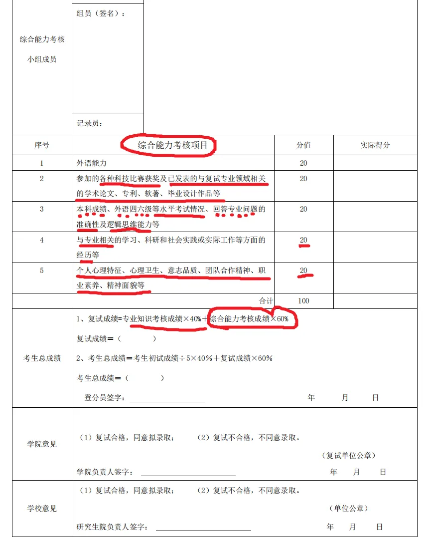 复试成绩=专业知识考核成绩×40%+综合能力考核成绩×60%专业综合能力考察(下表1、2、3,100分),本科学业+科研实践方面(下表4,占25分),表达能力方面(下表5,占10分),外语能力方面(下表6,占10分),礼仪(表中7,占5分)。