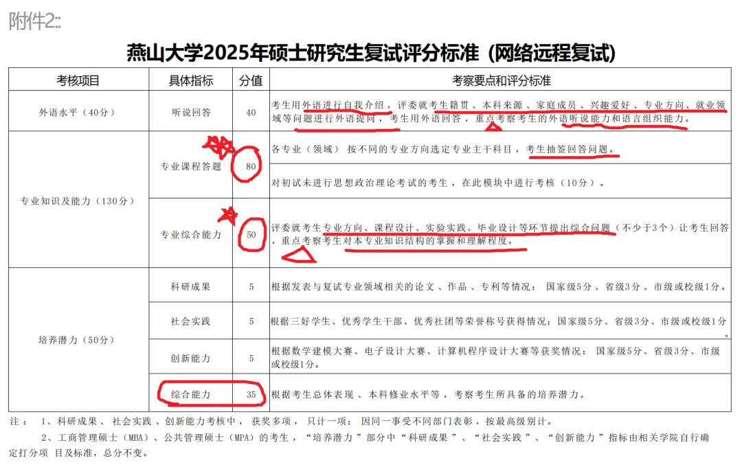 不同专业复试面试评分有差别,总体来说,专业综合能力分值占比最高,评委就专业领域提出5个综合问题让考生回答,重点考查考生对本专业知识结构的把握和理解程度,科学研究、社会实践或实际工作表现等方面的情况。其次是逻辑思维能力、语言表达和综合素养。燕山大学2025年硕士研究生复试评分标准,含现场复试和网络复试2025年的复试评分标准,有外语水平、专业测试和综合面试几个部分。外语有笔试,专业测试也是笔试,综合面试还包括了外语听说、专业综合能力、科研成果、社会实践、创新能力和综合能力。如果大家不知道英语口语部分如何入手准备,可以参考燕山大学的评分标准,首先考生需要英语自我介绍 ,评委就考生籍贯、本科来源、家庭成员、兴趣爱好、专业方向、就业领域等问题进行外语提问,那么涉及到这些的英语相关词句,大家要做好准备,并且背熟到能够很自然、不卡壳、流畅的表达。如果考场提问到自己没有准备到的内容,灵活应变。专业知识方面,线上复试的没有笔试,专业课采用问答形式,考生抽签回答问题,关于专业综合能力,主要考察考生对本专业知识结构的把握和理解程度。个人培养潜力综合能力从考生过往经历评分,包括考生的科研成果、社会实践、创新能力,综合能力根据考生的回答问题的表现,本科修业水平等等。燕山大学复试评分标准