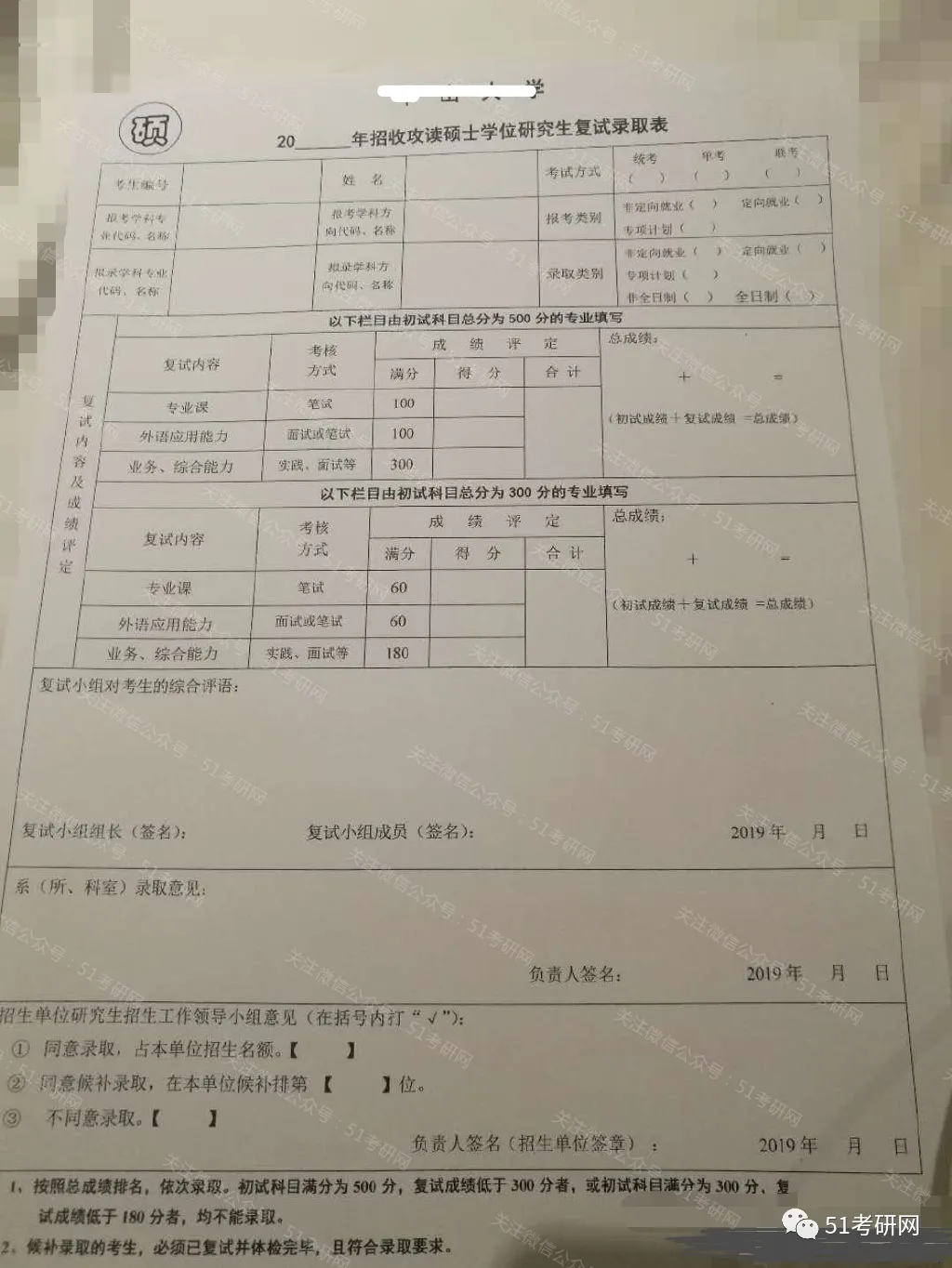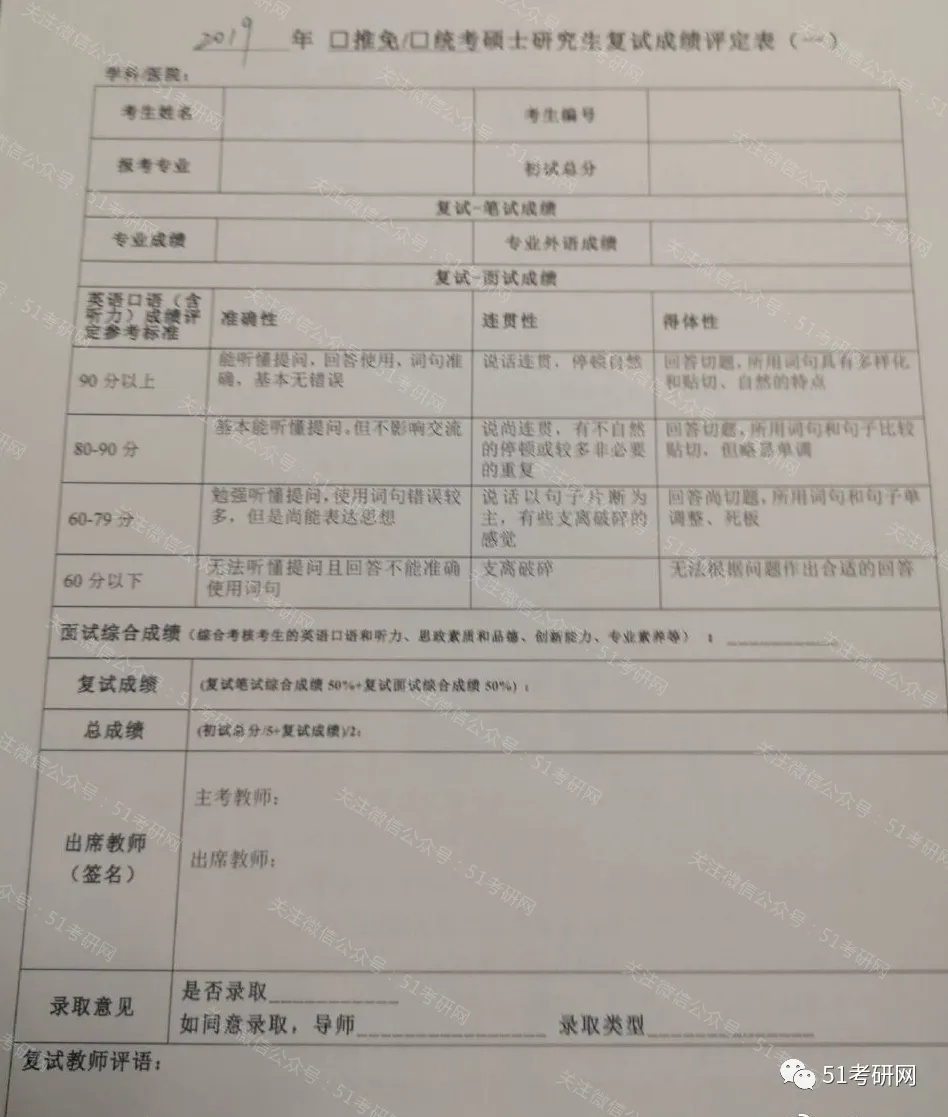 今年可能还会是以线下现场复试为主,部分像调剂生可能会采取网络复试。如果线上的话则可能取消笔试,用口试的方式代替。大家一定要注意在回答问题时首先要礼貌,不要“抬杠”,更不要表现不尊重面试老师。一方面考察专业知识,另一方面还会重点看考生的心理素质,不懂得变通、死板、情绪容易激动、或者其他比较极端的表现,导师选择学生比较怕这样的,因为读研需要一定的抗压能力,动不动就情绪激动,表现极端,老师也不敢要的。结合上面的复试评分表,建议大家把一些考查的重点关键词写下来,然后对照着去准备,弥补不足。真心希望关注51考研网的同学们都能上岸!努力!加油!冲鸭!你一定会上岸哒!往期更新:
