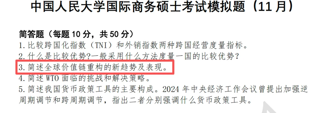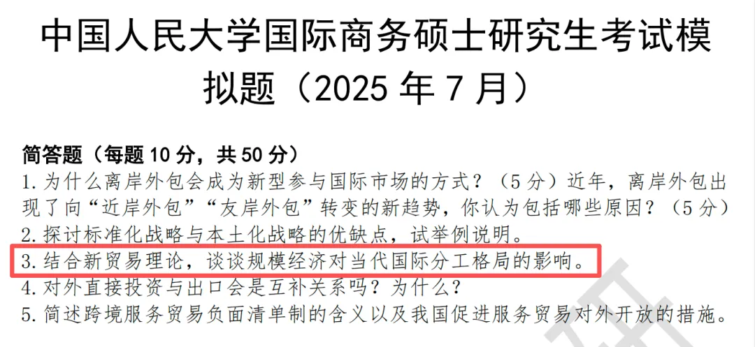 26 考研初试已过去一个多月,在整理26年人大国际商务考研真题的过程中,我们发现,本年度专业课的很多真题考点,除了利用好【招财猫人大国商背诵讲义】就可以高效应对外,过去一年为 26 学员打造的 6 次模拟测试,也精准命中多个核心考点。备考期间,我们多次强调了模考的核心价值:一方面通过实战化训练,帮助大家适应考场节奏、答题逻辑与时间把控能力;另一方面,通过高还原的真题考点设计,为大家的真题作答积累核心抓手。此外,押中真题的“彩蛋“也在模考中等待大家解锁。