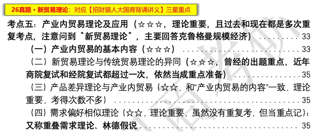 【考点评述】本题为概念类题型,整体难度较低。新贸易理论是人大国商考研的常规核心考点,该考点及相关应用在历年初试中累计考察 7 次,复试(笔试 + 面试)中累计考察 13 次,呈现隔年重复命题的显著特征,是【招财猫人大国商背诵讲义】中明确标注的三星(最高级别)重点内容。