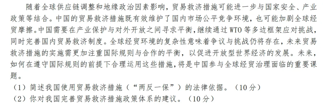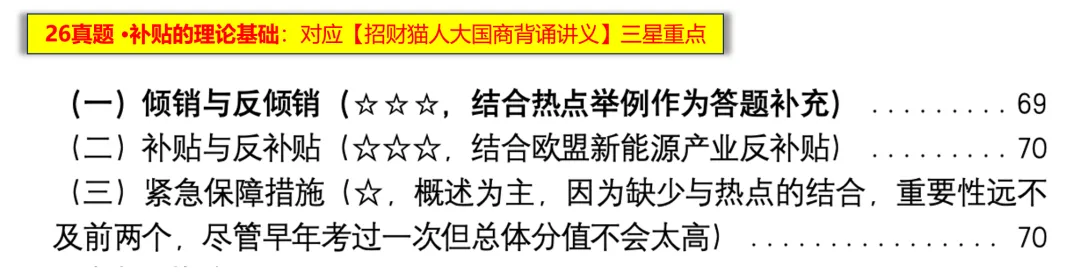 【考点评述】本题为概念原理类题型,整体难度中等。“两反一保” 是人大国商考研的经典考点,属于【招财猫人大国商背诵讲义】中明确标注的三星重点内容。该考点命题呈现循序渐进的特点,25 年真题重点考察倾销相关内容,26 年则将考察核心聚焦于补贴板块。从历年命题情况来看,该考点在初试中累计考察 3 次、复试中累计考察 2 次,且常以间接形式出现,或作为核心答题要点支撑完整答案。