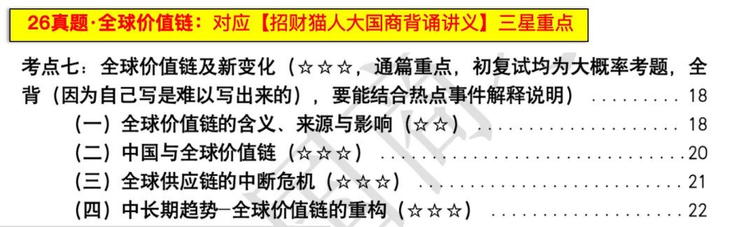 【考点评述】本题为材料题,以全球价值链为背景,较易,是人大国商必会的知识点,招财猫国商在全程班中也反复强调价值链的重要性,并为同学们总结了“价值链五问法”,是【招财猫人大国商背诵讲义】中的三星重点。本题给出了一个具体的材料,需要结合材料分析。这类题目的答案通常都隐藏在材料当中,因此前两问结合材料进行分析即可。第三问为原因类话题,结合价值链进行考察,价值链是国商出题的经典热点话题,在历年考题中,初试出现4次,复试出现10次。因此,本题在回答时应当结合材料和所学知识,分析原因。