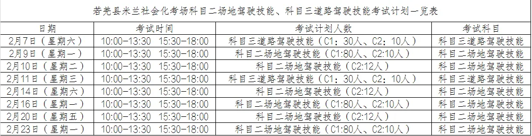 为切实应对高校学生寒假期间集中驾考现象,充分保障大学生群体驾考需求,若羌县公安局交通管理大队将在2月期间增加多场考试计划。现将近期科目二场地驾驶技能、科目三道路驾驶技能考试预约计划公布如下,请考试学员登录公安部“交管12123”手机APP进行网上预约。