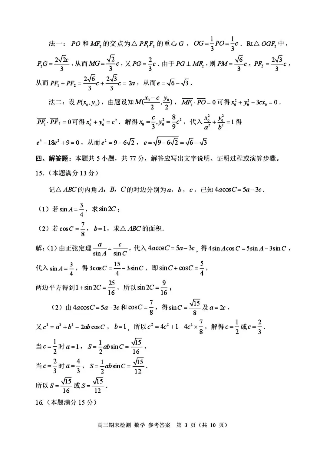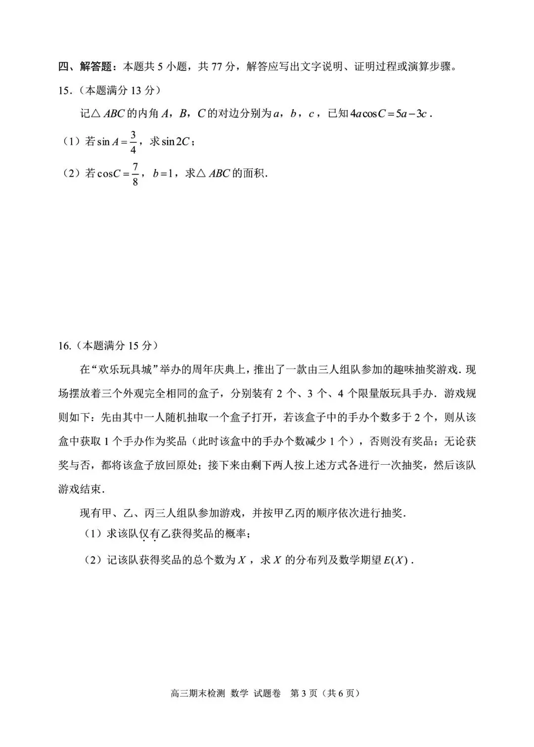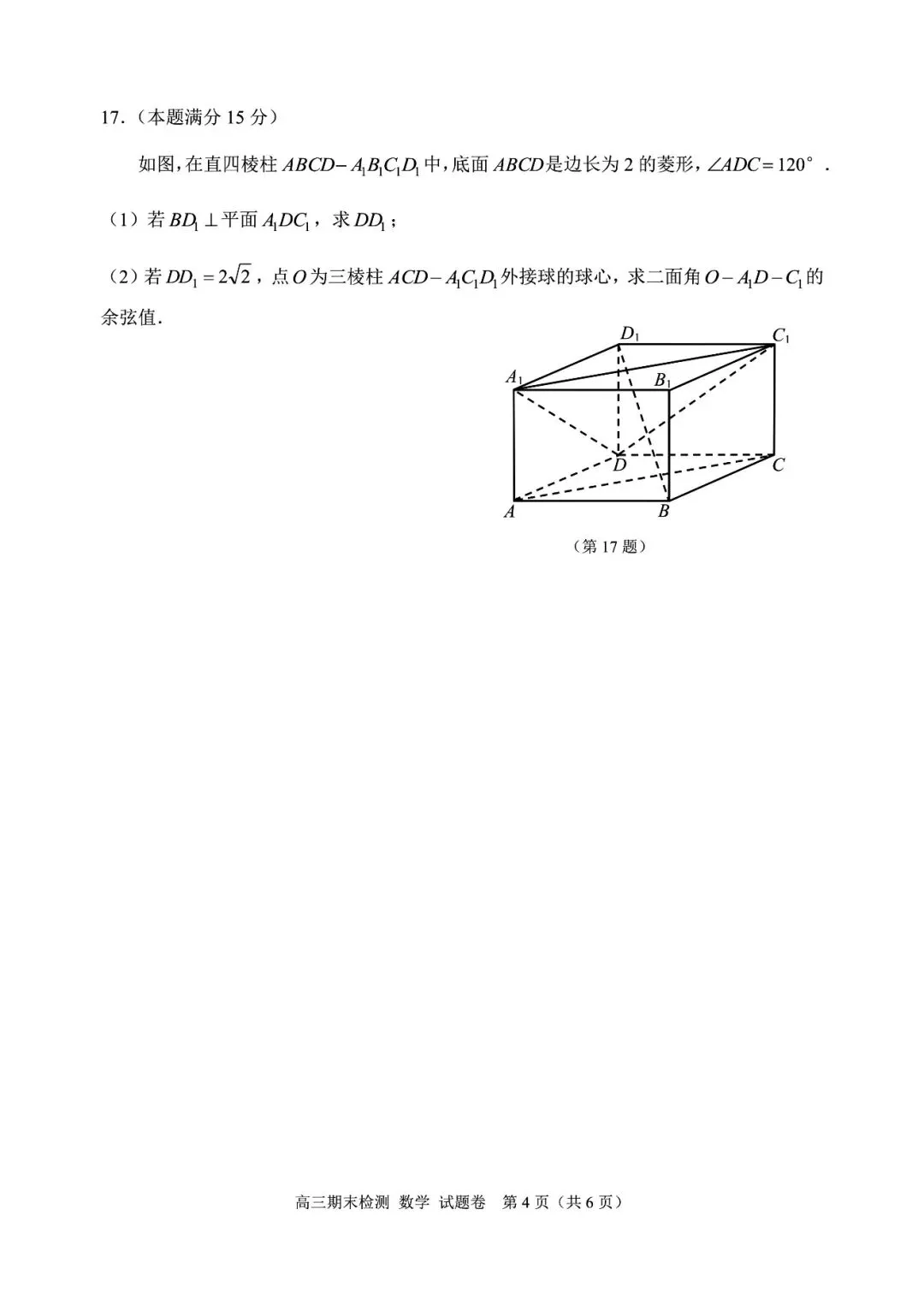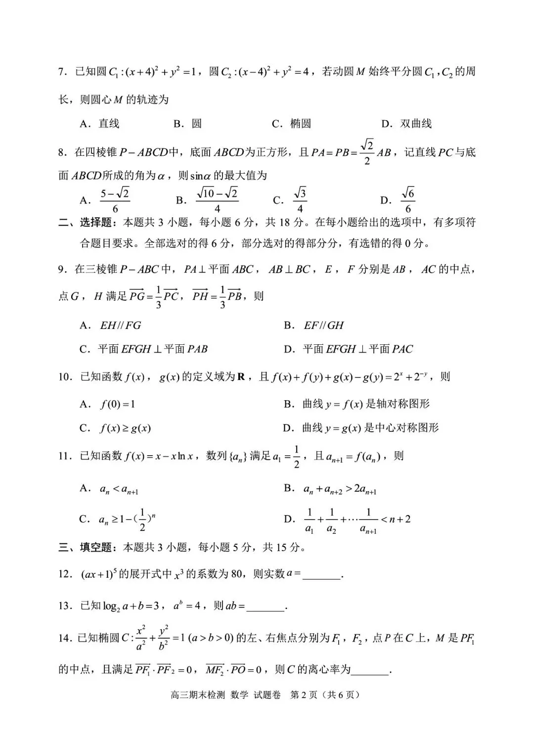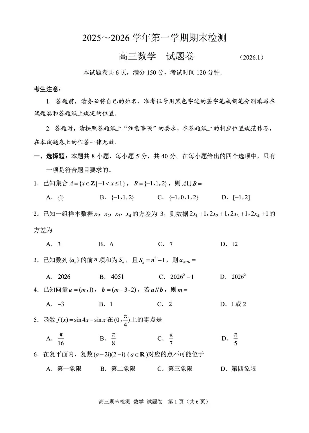 >2026年2月嘉兴市高三(上)学期期末考试数学试卷(附参考答案)