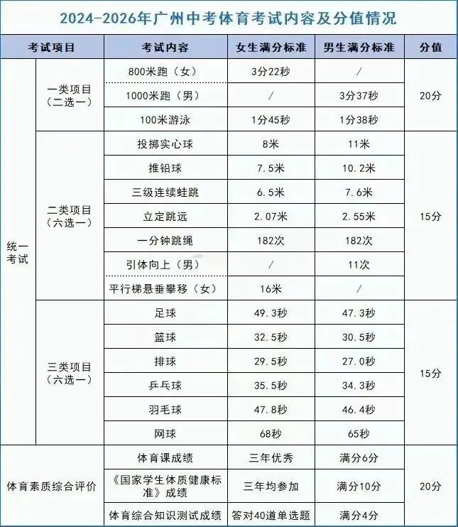 根据广州市教育局之前发布的《2024-2026年广州市初中学业水平考试体育与健康考试项目规则与评分标准》,2026年广州体育考试由统一考试和体育素质综合评价两部分组成。