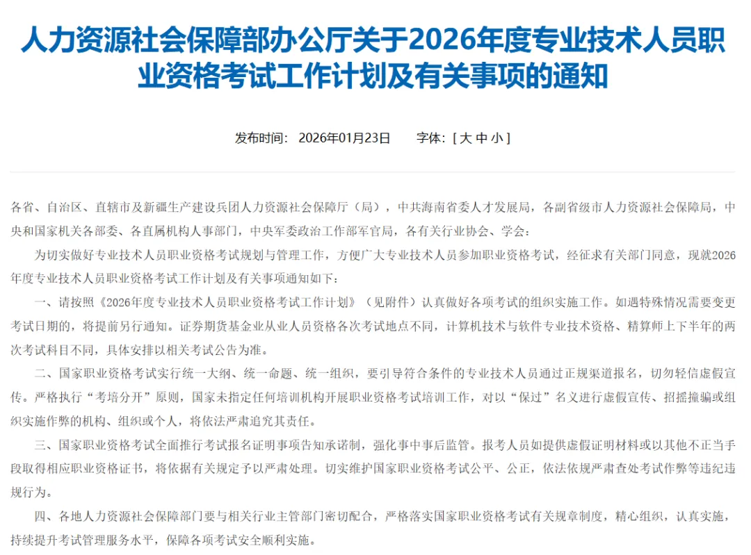 人社部已发布《人力资源社会保障部办公厅关于2026年度专业技术人员职业资格考试工作计划及有关事项的通知》。