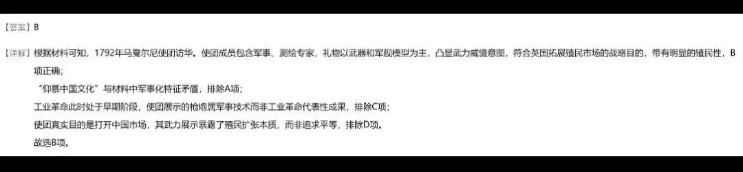 可见,这些要求并无“殖民”意图。即便是“于珠山附近划一未经设防之小岛归英国商人使用”的要求,也仅仅是效法葡萄牙人在澳门定居、向清政府缴纳地租的方式,而并非要求清廷割让领土——这个位于舟山群岛附近的小岛即便是“归英国商人使用”,英国人也仅能享受租居权而已。在号主看来,此处不选D项的缘由也很简单——与题目主旨无关。