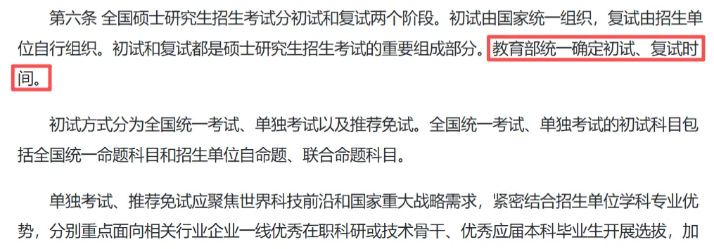教育部在《2026年全国硕士研究生招生工作管理规定》中明确指出:教育部统一确定初试、复试时间。