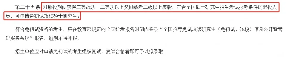 教育部在《2026年全国硕士研究生招生工作管理规定》中,以往符合免初试资格的只有在部队荣立二等功以上的退役人员,今年这一范围得到了扩展,增加了对服役期间获得三等战功的退役人员的免初试攻读硕士研究生的资格。